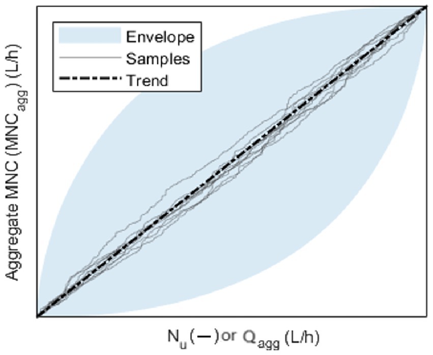 As to step 3, it is worth noting that users’ aggregation can be carried out with different sorting criteria, leading to different sequences of MNCagg, with only the first and last elements being the same. In fact, the first and last elements are equal to 0 (no users) and to the MNCagg value for the full group of users in the DMA, respectively. Then, a graph like the one in Figure 1 can be constructed, in which MNCagg is plotted against the aggregate number of users Nu or the aggregate consumption Qagg. In this graph, various MNCagg(Nu), or MNCagg(Qagg) patterns can be considered, including those obtained from random aggregation samples. The envelope including all the potential MNCagg(Nu), or MNCagg(Qagg) patterns is delimited by two boundary lines. The lower line is obtained by considering the aggregation of users sorted based on increasing values of MNC, or MNC/Q. The upper line is obtained by considering the aggregation of users sorted based on decreasing values of MNC, or MNC/Q. Finally, the trend of the linear model (constructed in step 4 based on Equation 2 or Equation 3), associated with the straight line connecting the first and last dots, which are the same for all aggregation sequences, can be plotted on the graph.