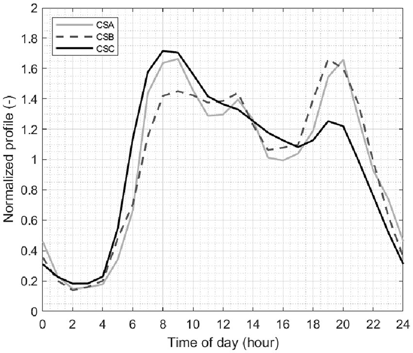 Figure 4 shows the (normalized) daily average aggregate profiles. In all case studies, aggregate daily consumption is heavily dominated by residential users, who represent the primary source of consumption. As a result, the overall profile shapes are similar to the residential patterns observed in panel (a) of Figure 3. Overall, CSA and CSB present similar profiles, with three distinct peaks. Conversely, the profile for CSC shows only two peaks—the former in the morning and the latter, less pronounced, in the evening—alongside a generally declining trend from morning to evening. This divergence between CSA/CSB and CSC may reflect different user habits between Northern and Southern Italy.