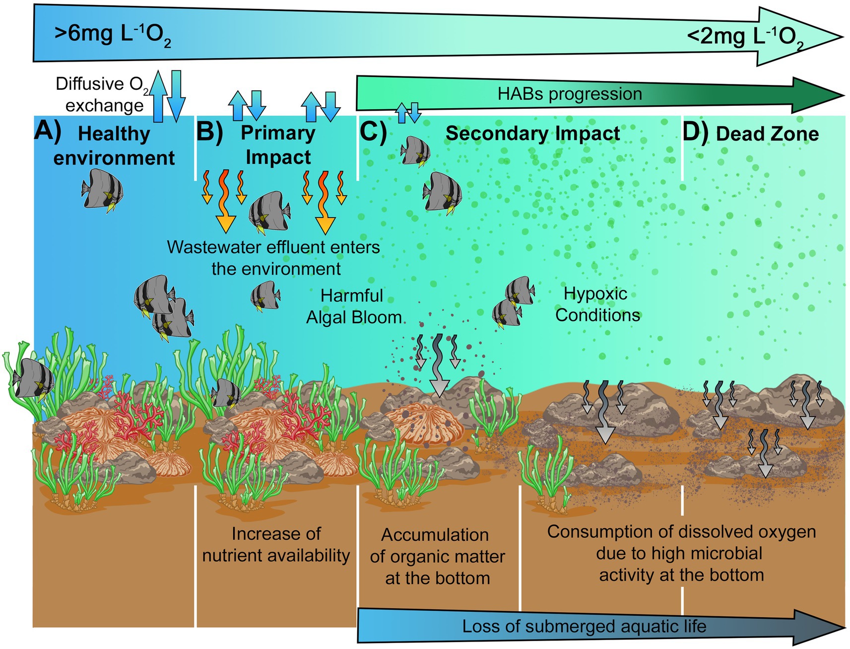 Figure 1. An illustration of the eutrophication phenomenon. (A) Stable situation with a healthy environment in which nutrient availability is within the standard range (i.e., dissolved oxygen levels above 6 mg L−1). (B) Nutrient load is strongly linked with wastewater effluents discharged into the coastal environment. The eutrophication of the environment begins, and the first symptoms become detectable. We can observe an algal bloom that can be classified as harmful (Primary Impact). (C) The propagation of the HAB induces a strong consumption of dissolved oxygen in the water column due to the high microbial activity at the bottom of the area alongside the alteration of gas exchanges at the surface layer (Secondary Impact). The hypoxic condition is established (DO < 2 mg L−1). Marine organisms start to encounter difficulties. At this point, complex organisms experience physiological stress that can result in death (i.e., mass mortality events) or they can migrate to a healthier environment, if possible. (D) Dead zone formation unfolds. Orange arrows: nutrient load input; Grey arrows: accumulation of organic matter and dead organisms at the bottom; Blue arrows: oxygen dynamics at the surface level.