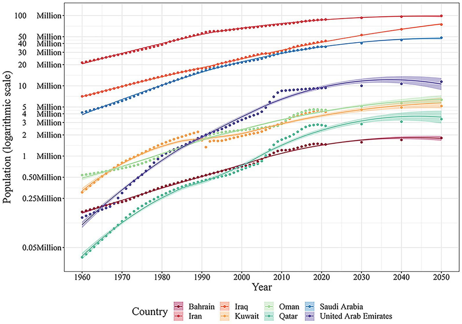 The Gulf’s extreme conditions make it a marginal marine system from an environmental perspective, but rapidly increasing human pressures, due to urbanization and industrial expansion, significantly compound these vulnerabilities. Since the discovery of oil and gas reserves in the 1930s, the eight Gulf-bordering nations have experienced rapid population growth, driven initially by fossil fuels and subsequently by diversified economic activities such as tourism, real estate development, manufacturing, construction and transportation (Van Lavieren et al., 2012). In 2012, the regional population growth rate for the countries surrounding the Gulf stood at 2.1%, nearly double the global average (1.1%; Van Lavieren et al., 2012). Current projections anticipate a further population increase of 19% between 2023 and 2050 (Figure 3), bringing the total regional population to 250 million (World Bank Group, 2024a). Notably, this growth is highly concentrated in coastal areas; in most countries surrounding the Gulf, at least 85% of the population resides within 100 km of the shoreline (Van Lavieren et al., 2012), and approximately 15 million people occupy 26 major urban centers along the Gulf coast (Burt et al., 2024). Such high-density coastal urbanization directly amplifies municipal wastewater discharge, intensifying nutrient loading and exacerbating eutrophic conditions in coastal marine environments (Ismail and Shehhi, 2022).