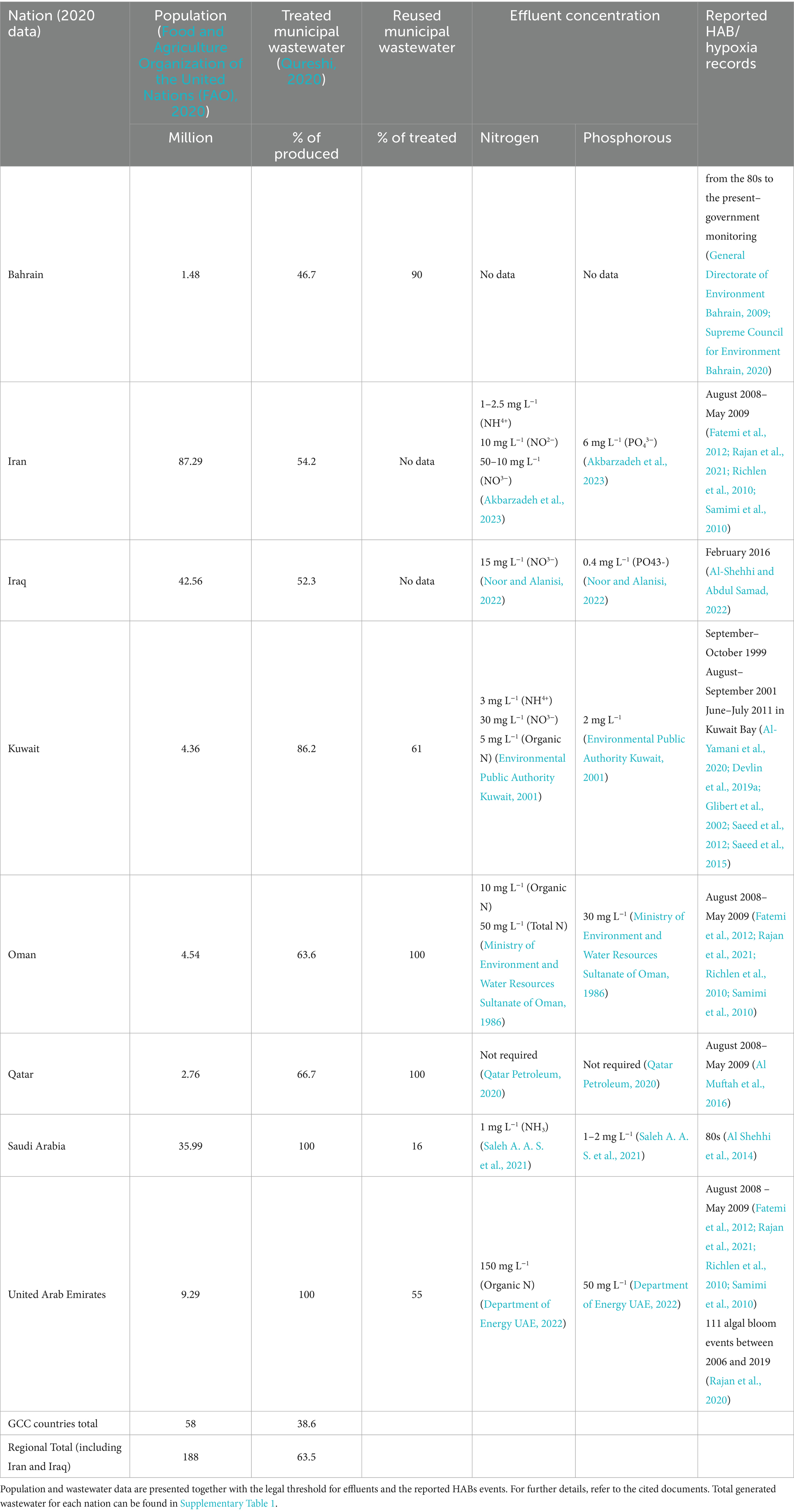 Effective wastewater management is critical in the Gulf context, where extreme evaporation, limited riverine input, and rapid population growth enhance the vulnerability of coastal waters. In 2020, the eight Gulf nations collectively produced an estimated 8.6 billion m3 y−1 of municipal wastewater (Supplementary Table 1; World Bank Group, 2024b), a volume more than six times larger than the annual discharge of the Tigris-Euphrates River (1.39 billion m3 y−1) into the Arabian Gulf (Al-Asadi, 2017). This production varies significantly, with just three countries contributing 84% of the total wastewater (Iran: 4.6 B m3 y−1, Saudi Arabia: 1.55 B m3 y−1, and Iraq: 1.11 B m3 y−1), whereas less populous nations such as Bahrain generated only 0.15 B m3 y−1 (Supplementary Table 1). A large fraction of this wastewater effluent has been released directly into the marine environment either untreated or only partially treated (Qureshi, 2020). Insufficient nutrient removal elevates coastal nitrogen and phosphorus loads, driving harmful algal blooms and hypoxic events (Devlin et al., 2019a; Devlin et al., 2015). The underutilization of reclaimed water further exacerbates freshwater scarcity, imposing heavy and largely avoidable economic and ecological costs on Gulf nations.