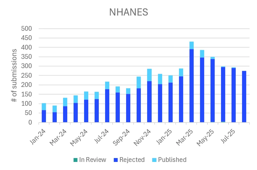 Robust screening also reduced NHANES submissions, but growth continued into 2025. Early this year we became the first publisher to make the external validation requirement explicit for all papers based on simple queries of public data, including NHANES articles, clarifying for authors and reviewers that each manuscript must contribute unique scientific value. Since adopting this stronger policy, we have rejected: