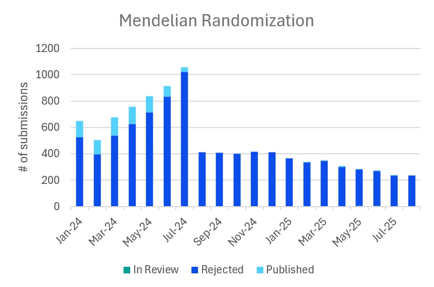 In July 2024 Frontiers became one of the first publishers to require independent external validation for all health-dataset MR studies. MR manuscripts lacking new validation or institutional data were declined at desk review. The effect was immediate: MR submissions fell 61 % in the first month and over 70 % to date.