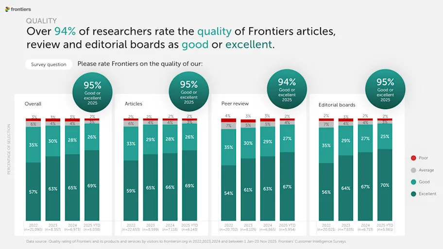 In 2025, that culture translated into tangible progress across research integrity, open science, and responsible innovation, reinforcing Frontiers’ role as a trusted force in global publishing. At every level of our work, one principle remained constant: a commitment to quality at scale.