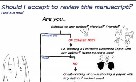 By Chloe Schmidt and Katherine Lawson You’ve just received an invitation to review a manuscript. Coincidentally, your expertise matches perfectly with its content! But before you go ahead and accept the invitation, there are a few other things to consider: for one, is there something that could interfere with your objectivity as a reviewer? For that matter, what’s considered a conflict of interest at Frontiers? Here’s a fun flowchart to help clarify whether you, as a reviewer, have any potential conflicts of interest with the authors (or editor) of a manuscript. If you find yourself in a situation where you answer yes to any of the questions below, do us a favor and drop the Editorial Office an email. Otherwise, happy reviewing!